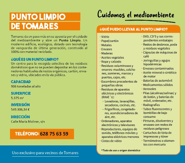 El Punto Limpio de Tomares, ubicado en la calle María Moliner, s/n y que da servicio a los vecinos del municipio, admite residuos de muy diversas categorías de origen o uso doméstico. Desde el 15 de septiembre, el horario de apertura es de 10:00 a 14:00 y de 16:00 a 19:30, de martes a viernes y de 10:00 a 15:00 horas, sábados, domingos y festivos. Los lunes, la instalación permanece cerrada. Residuos que se pueden depositar: