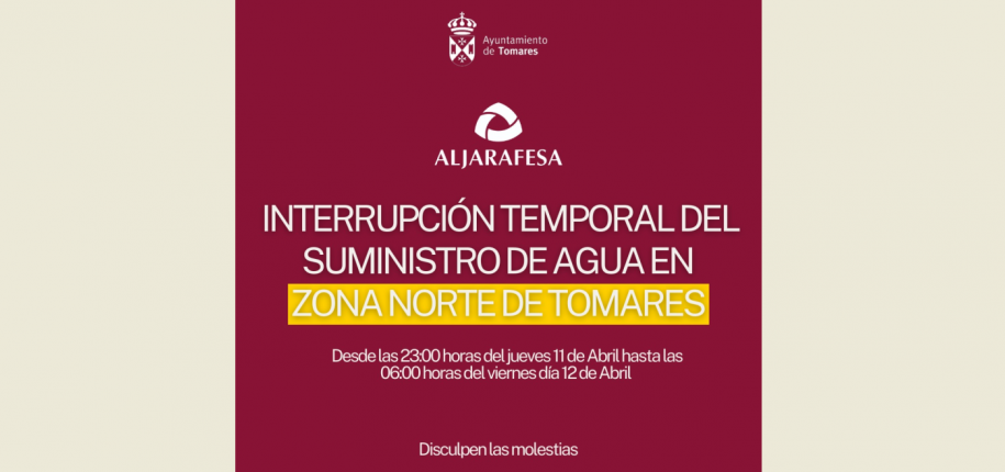 INTERRUPCIÓN TEMPORAL DEL SUMINISTRO DE AGUA EN LA ZONA NORTE DE TOMARES DESDE LAS 23:00 HORAS DE HOY JUEVES 11 HASTA LAS 06:00 HORAS DE MAÑANA VIERNES, 12 DE ABRIL