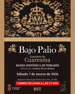 Un bello concierto, organizado por la Banda Sinfónica (BST) y el Ayuntamiento de Tomares, dentro de su Programación de Actos para que los tomareños disfruten de la Semana Santa, en el que los músicos de la Sinfónica, con la habitual maestría que les caracteriza, deleitarán al público con las Marchas Procesionales más emblemáticas de la Semana Santa.