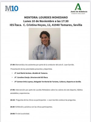 LA GIMNASTA OLÍMPICA LOURDES MOHEDANO OFRECERÁ UNA CHARLA EN EL IES ÍTACA DE TOMARES ESTE LUNES, 10 DE NOVIEMBRE, SOBRE LOS BENEFICIOS DEL DEPORTE Y HÁBITOS DE VIDA SALUDABLE