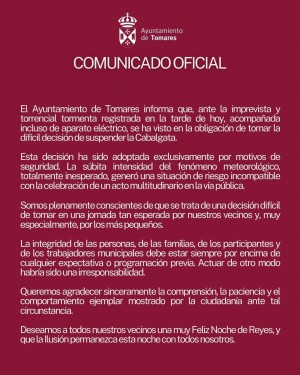 Tomares se ha visto obligado a suspender su gran Cabalgata de Reyes Magos 2026, por seguridad, debido a una gran tromba de agua que comenzaba justo media hora más tarde después de su salida a las 16:30 horas de la calle José Monge Cruz “Camarón de la Isla”. (Adjuntamos Comunicado Oficial emitido por el Ayuntamiento de Tomares).
