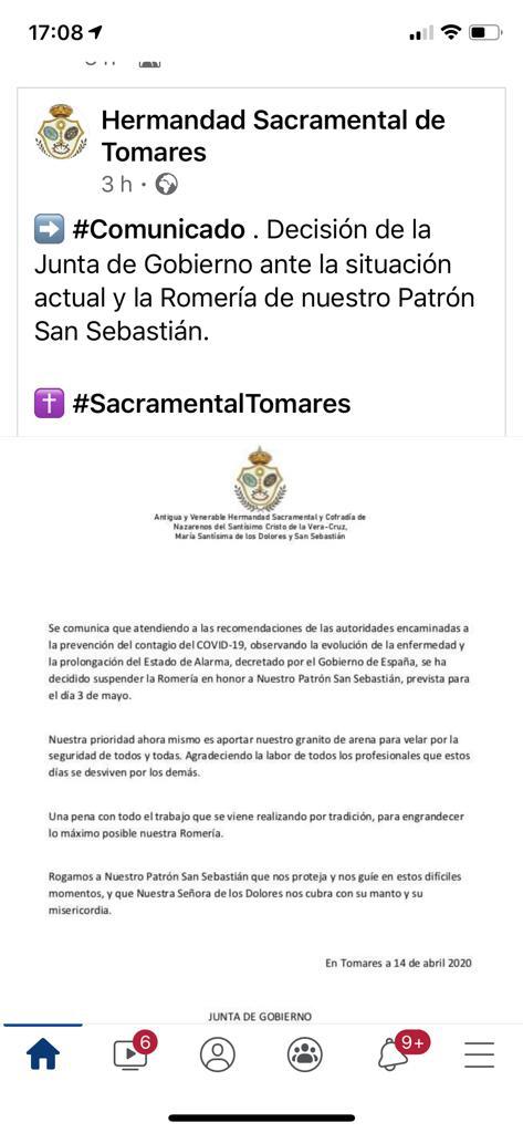 La Hermandad Sacramental de Tomares comunica que, atendiendo a las recomendaciones de las autoridades encaminadas a la prevención del contagio del coronavirus, observando la evolución de la enfermedad y la prolongación del estado de Alarma, se ha decidido suspender este año la Romería en honor al Patrón de Tomares, San Sebastián, que estaba prevista para el primer domingo de mayo, día 3.