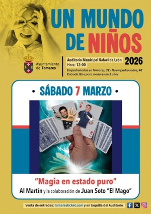 ¡Los reconocidos magos Al Martín y Juan Soto “El Mago” llegan a Tomares para llenar de ilusión y magia el Auditorio Municipal Rafael de León! El Ayuntamiento de Tomares acercará la magia a los más pequeños este sábado, 7 de marzo, con el espectáculo “La Magia en estado puro”, que entusiasmará a niños y mayores. Divertidos trucos de magia, efectos, apariciones y desapariciones, harán pasar a toda la familia una mañana mágica y muy entretenida. Será, como es habitual, a las 12:00 horas.