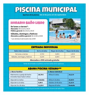 Desde el 19 de junio al 8 de septiembre, la piscina abre de lunes a viernes, de 12:15 a 19:15 horas para los abonados a las Instalaciones Deportivas Municipales (IDM), y de 14:15 hasta las 19:15 para el público general. Los viernes el cierre es a las 19:45 horas. Los sábados, domingos y festivos el horario es de 12:00 a 19:45 horas para todos los bañistas.