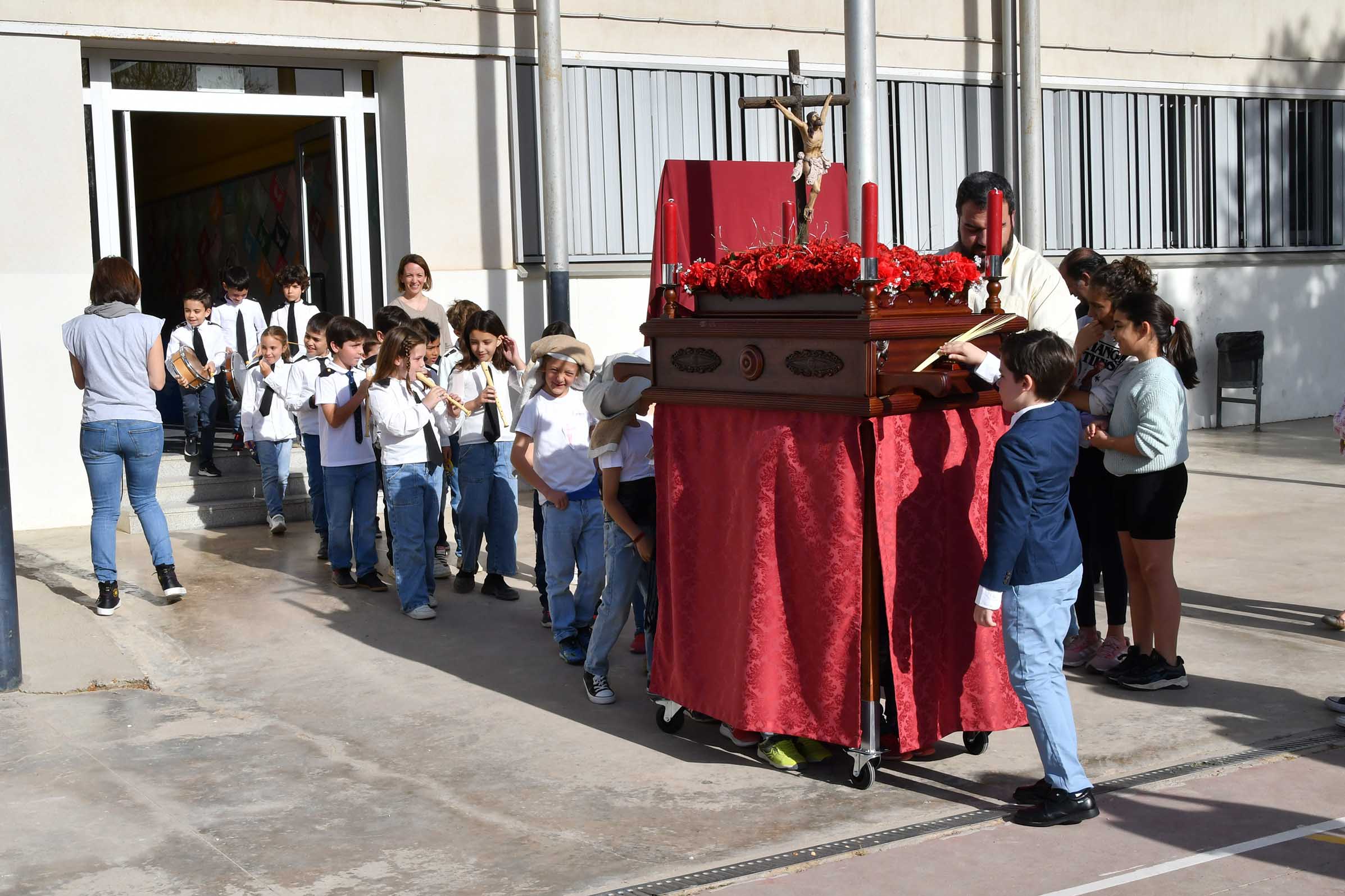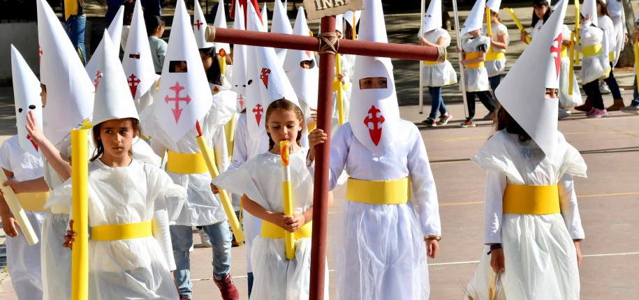 a Semana Santa ha empezado este Viernes de Dolores en Tomares con la procesión infantil que los alumnos de religión de 1º, 2º y 3º de Primaria del CEIP Juan Ramón Jiménez han celebrado en el patio del colegio. Una mañana de ambiente cofrade, en la que los pequeños, ataviados con trajes de nazareno y mantillas, han recreado el paso de una cofradía y emulado el fervor y devoción que se vive en las calles estos días de Pasión.