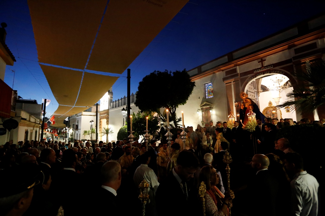 Calles engalanadas, lluvia de centenares de pétalos de flores y dos grandes alfombras de sal, realizadas por el Grupo Joven de la Hermandad Sacramental, decoraron el paso de la Virgen en su camino hacia Las Almenas. Horas de trabajo y dedicación de un barrio entero y de su asociación, presidida por José Muñoz Canela, para honrar y dar un emotivo y fervoroso recibimiento a la “Madre y Señora de Tomares", a la que Diego Cansino dedicó unas sentidas y escogidas palabras de elogio.