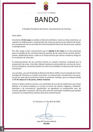 El Ayuntamiento de Tomares informa a los vecinos, mediante el siguiente Bando Municipal, sobre las medidas a adoptar en el traslado para la preparación de las carriolas de la Hermandad del Rocío para la Romería de 2026, que se celebrará desde el martes 19 al miércoles 27 de mayo.