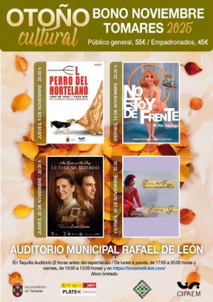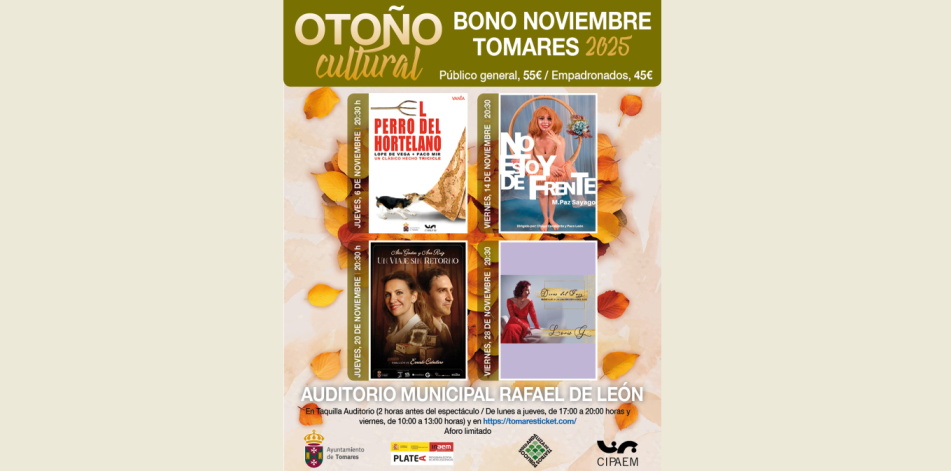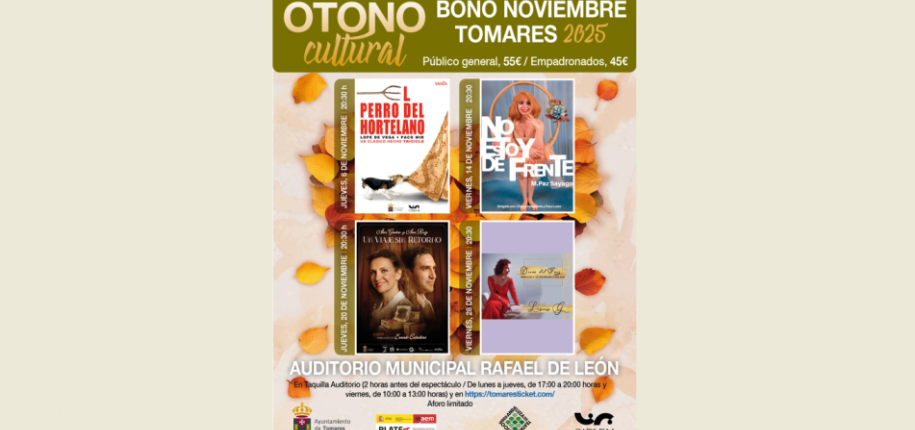 El Ayuntamiento de Tomares recuerda que aún puedes adquirir el Bono Descuento para poder asistir a un precio más reducido a las cuatro grandes producciones que aterrizarán este mes de noviembre en el Auditorio Municipal Rafael de León, a las 20:30 horas, dentro de la amplia Programación del “Otoño Cultural” con más de 50 eventos. Cuatro espectáculos que están siendo todo un éxito en los principales teatros españoles. ¡Consigue tu BONO DESCUENTO! 45 euros para empadronados y 55 euros, no empadronados, en https://tomaresticket.com/bono-cultural-noviembre/ o en https://www.giglon.com/todos?idEvent=bono-otono-cultural--noviembre. También en la Taquilla del Auditorio Municipal (2 horas antes de cada espectáculo) o bien de lunes a jueves, de 17 a 20 horas, y viernes, de 10 a 13 horas. Plazas limitadas.