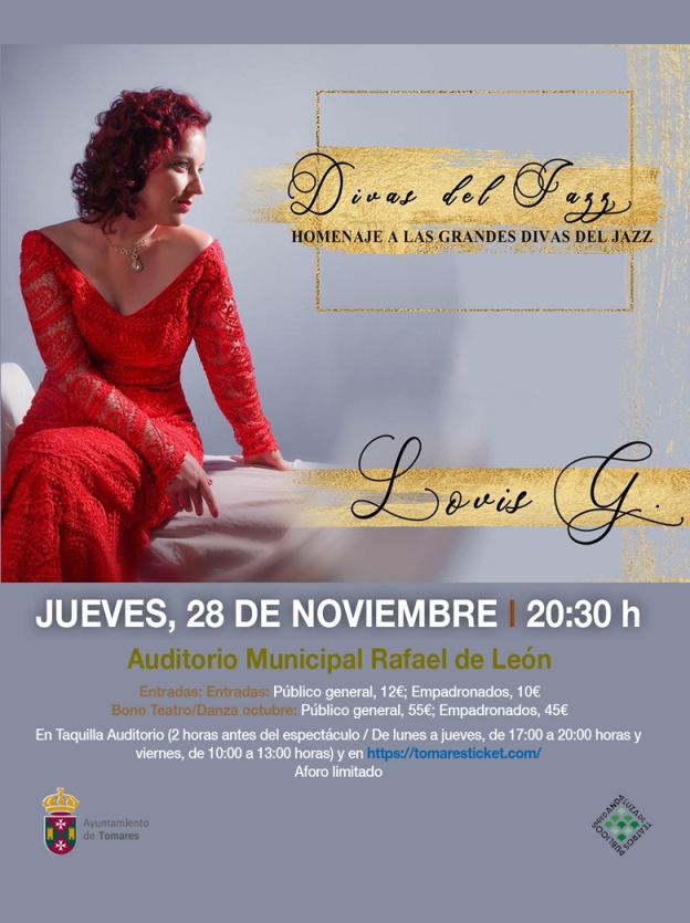 - VIERNES, 28 DE NOVIEMBRE: “DIVAS DEL JAZZ”, UN HOMENAJE A LAS GRANDES DIVAS DEL JAZZ. A las 20:30 horas, en el Auditorio Municipal Rafael de León. La cantante de Jazz Lovis G. rinde homenaje a las grandes voces femeninas del género, junto a músicos de prestigio internacional, mostrando al público la creatividad artística y la fuerza de las protagonistas femeninas del Jazz. En un género dominado por hombres, estas figuras del jazz femenino fueron las pioneras en la lucha por la igualdad entre géneros. Iconos del jazz sobresalieron por su enorme talento y creatividad artística, inspirando a toda una nueva de generación de mujeres músicos. Se realizará un merecido homenaje a figuras como Abbey Lincoln, Ella Fitszgerald, Sarah Vaughan, Nina Simone, Rechelle Ferrel, Anita O’day, Betty Carter, Billie Holiday, Diane Reeves o Dee Dee Bridgewater. Entradas a 10 euros para empadronados y 12 euros para el resto del público, en: https://www.giglon.com/todos?idEvent=divas-del-jazz-lovis-g-8tet