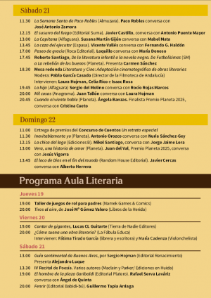 También vuelve en esta edición el programa “Aula Literaria”, con talleres, charlas y recitales, entre otros. El jueves, por ejemplo, habrá un Taller de rol para padres, a las 19:00 horas, impartido por Namek Games a & Comics o la presentación del libro “Tiros al aire” de Víctor Jiménez a las 20 horas; el viernes, a las 20:00 horas, Fátima Tirado, Juan Andrés Moya y Ana barrera, que hablarán sobre “Cómo suena una obra literaria”, o el sábado, a las 13 horas, la presentación del libro “Guía sentimental de Buenos Aires”, por Sergio Hojman, y a las 13:30 horas, el IV Recital de Poesía.