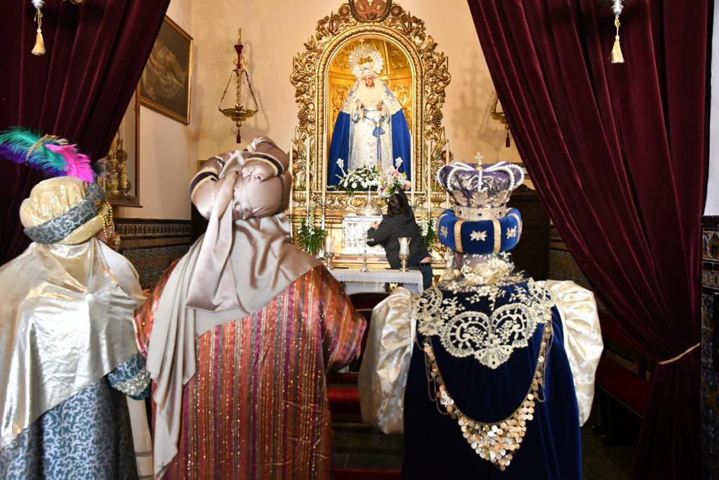 Melchor, Gaspar y Baltasar cumplen con esta tradición como hace 2021 años y han visitado la Parroquia de Nuestra Señora de Belén de Tomares y entregado un ramo de flores a la Virgen de los Dolores
