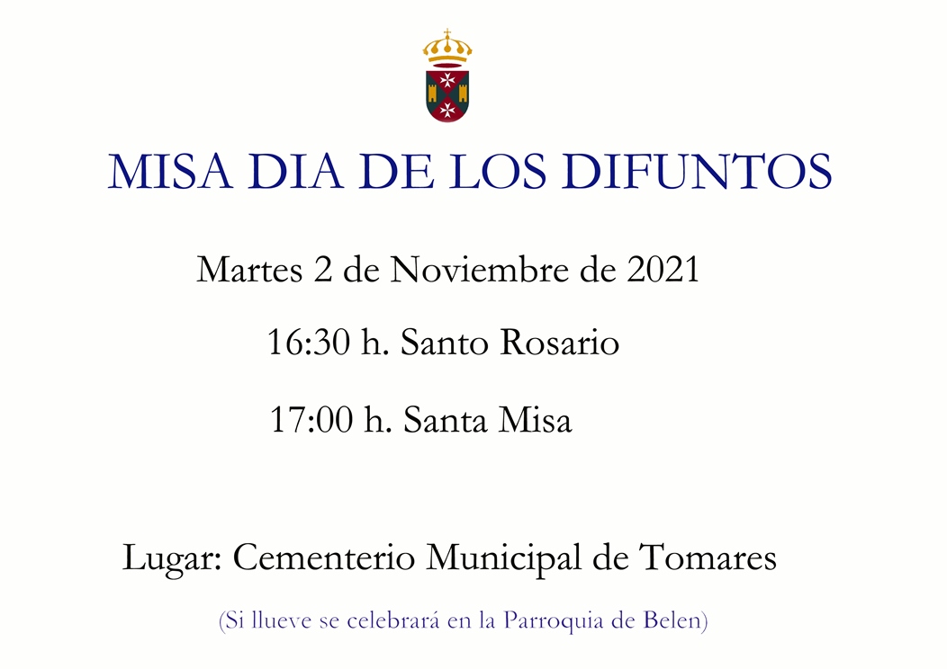 TOMARES ACOGE EL ROSARIO Y LA MISA POR EL DÍA DE LOS DIFUNTOS ESTE MARTES 2 DE NOVIEMBRE, A LAS 16.30 HORAS, EN LA PARROQUIA NTRA. SRA. DE BELÉN