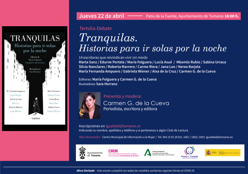 El Ayuntamiento de Tomares acoge este jueves, 22 de abril, una tertulia-debate con la editora, periodista sevillana y una de las escritoras del libro Tranquilas: Historias para ir solas por la noche, editado por Lumen, Carmen G. de la Cueva, una obra integrada por catorce relatos narrados por 14 grandes escritoras españolas que reivindican “vivir sin miedo”. Emotivos relatos, muchos de ellos autobiográficos, con los que muchas mujeres se sentirán identificadas.