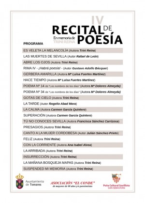 Tomares ofrecerá este viernes, 17 de octubre, el IV Recital de Poesía en memoria de Trini Reina, un bello recital poético en homenaje a la querida vecina, escritora y poetisa de Tomares, Trinidad Reina Ramos, en el que participarán una decena de vecinos y poetas de Tomares y del Aljarafe. Será a las 20:00 horas en la Asociación “El Conde” de Mayores de 60 años y/o Pensionistas (Avda. Blas Infante, s/n). Entrada libre hasta completar aforo.