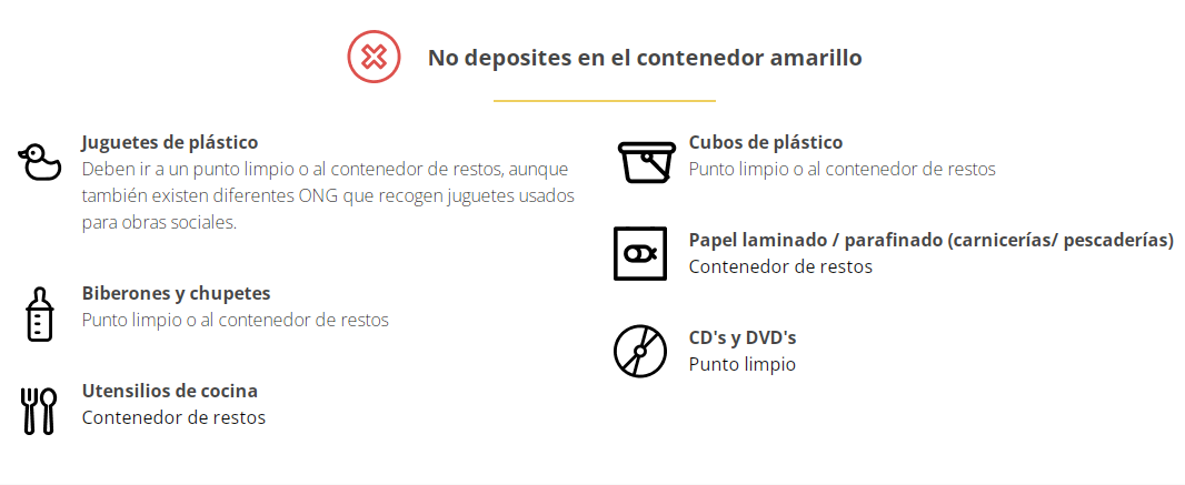 Es lógico pensar que todos los objetos que estén fabricados con plástico y que ya no nos son de utilidad, van al contenedor amarillo, pero no siempre es así. En el contenedor amarillo debe depositarse exclusivamente lo citado anteriormente.