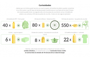 ¿Sabías que con 6 briks puede hacerse una caja de zapatos? ¿Y qué 40 botellas de plástico pueden convertirse en un forro polar? ¿O que 80 latas de bebidas pueden transformarse en una llanta de bicicleta? ¡Estos son solo algunos ejemplos! Si reciclas, ayudas a reducir los residuos que se vierten, a proteger el medioambiente y a dar una segunda utilidad a las cosas.