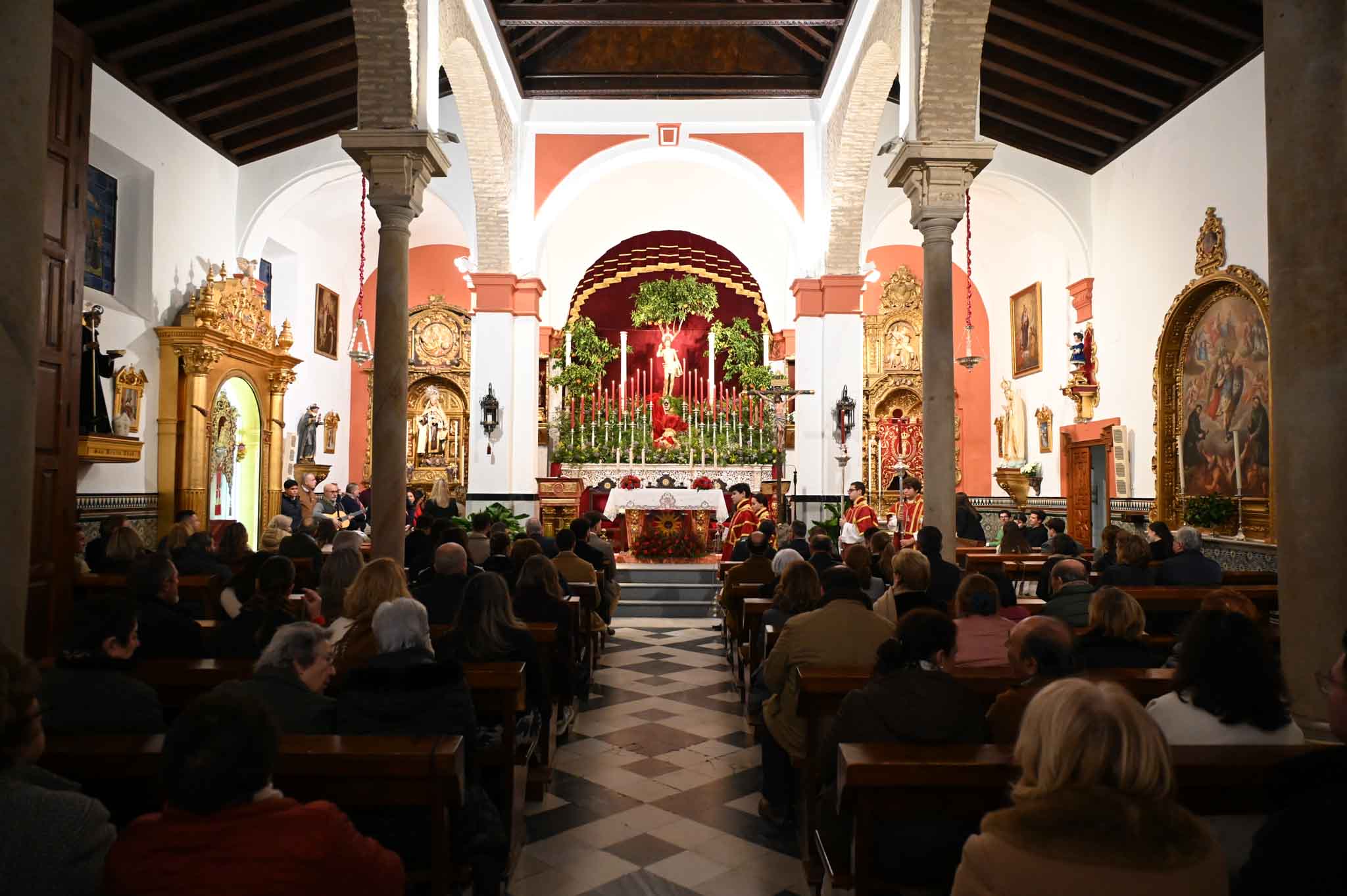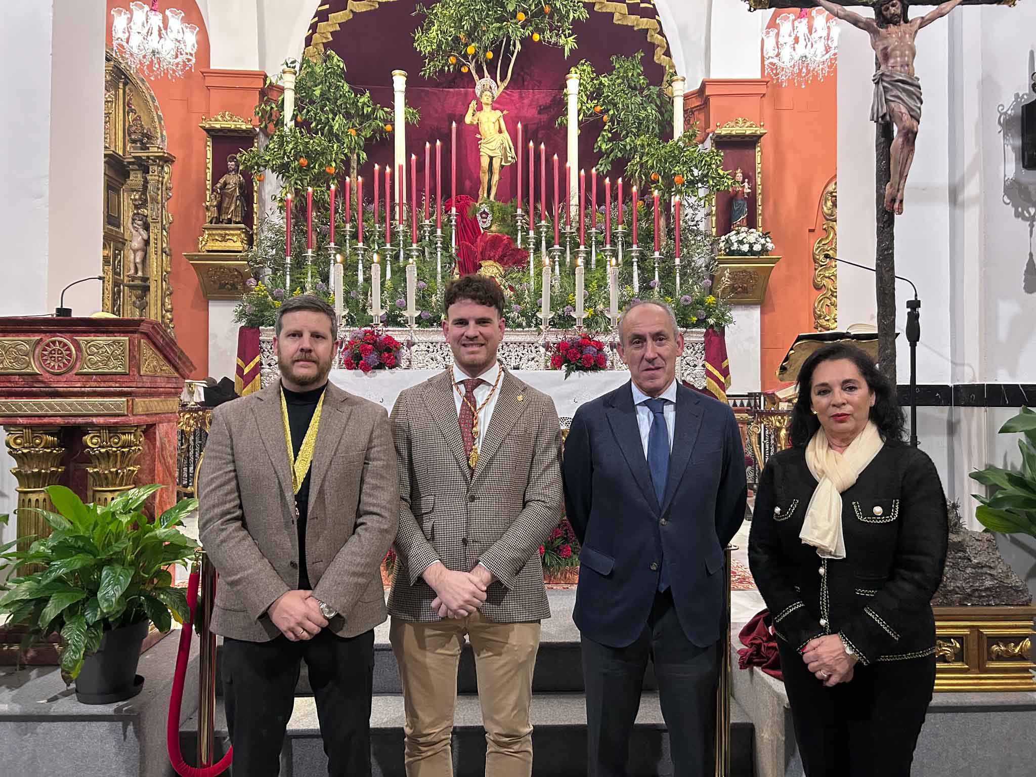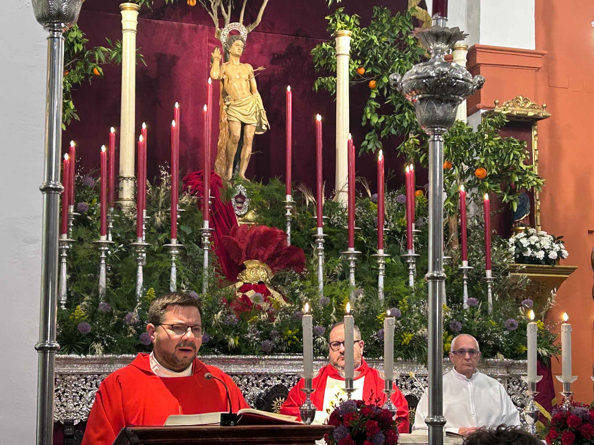 Con San Sebastián presidiendo el Altar Mayor en la Parroquia Ntra. Sra. de Belén, el Solemne Triduo en honor al Patrón ha dado comienzo este martes, 20 de enero, justo el día de su onomástica. Acto que estuvo presidido por el alcalde de Tomares, José María Soriano, y el Hermano Mayor de la Hermandad Sacramental, José Joaquín Manzano Vega, y fue oficiado por el Párroco de la Parroquia de Santa Eufemia y San Sebastián, Martín González del Valle, quien también estará el jueves.