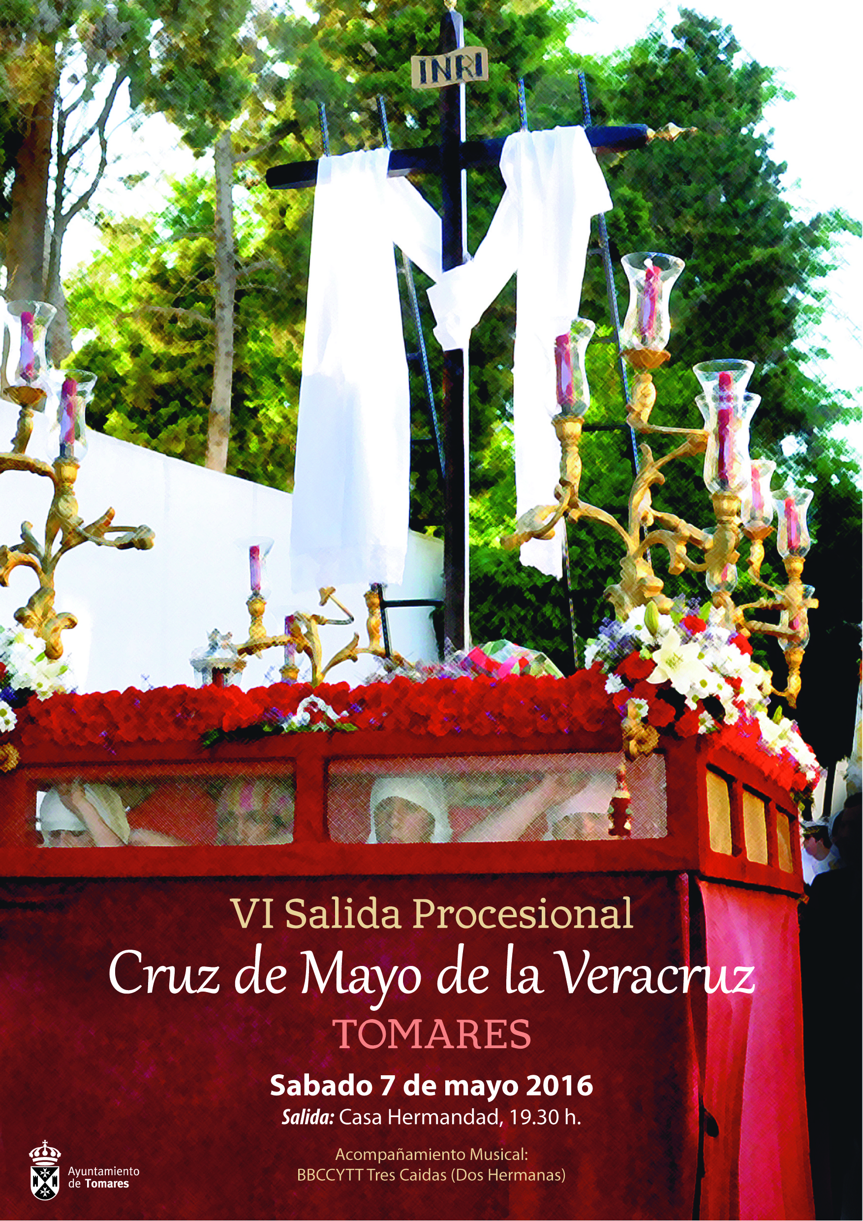 La Cruz de Mayo de la Vera Cruz, que recorrerá las calles de Tomares por sexto año consecutivo, saldrá en procesión el sábado a las 19:30 horas de la tarde de la Casa de Hermandad de la Sacramental. Cuatro horas estará la Cruz de Mayo en la calle. Avanzará entre cortitas chicotás bajo el son, por primera vez, de la Banda de Cornetas y Tambores de Las tres caídas de Dos Hermanas, que con su música animarán las calles atrayendo a numerosos vecinos que se irán acercando a lo largo de todo el recorrido por diferentes puntos de la localidad.