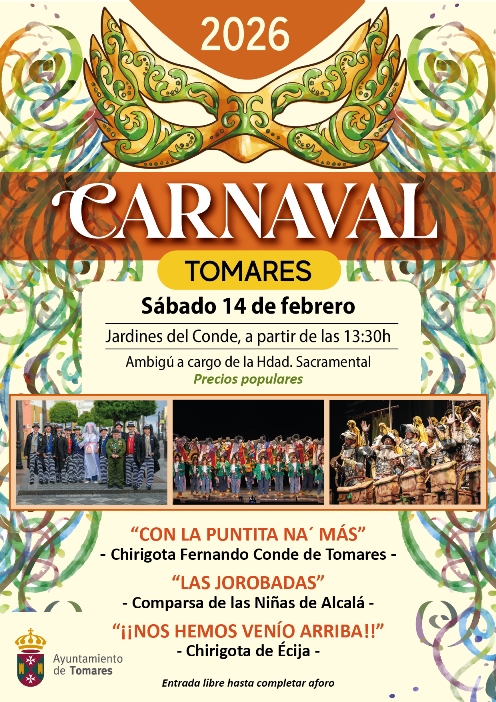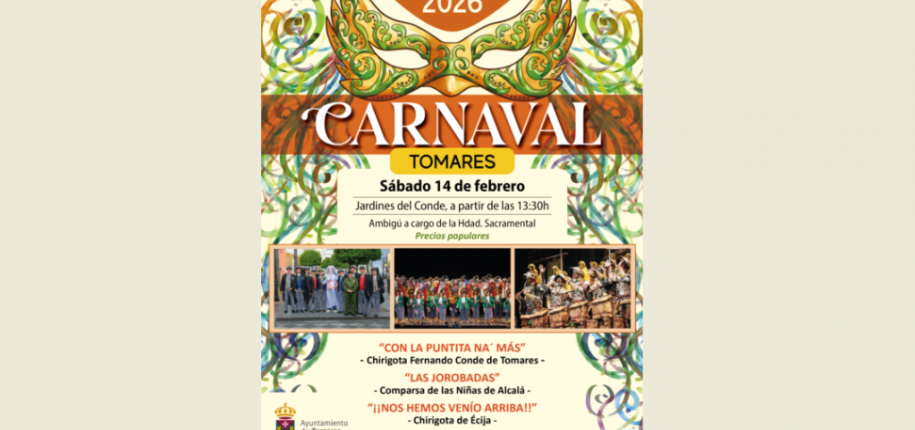 TOMARES CELEBRARÁ SU CARNAVAL ESTE SÁBADO, 14 DE FEBRERO, CON LA COMPARSA LAS NIÑAS DE ALCALÁ “LAS JOROBADAS” Y LAS CHIRIGOTAS DE ÉCIJA “¡¡NOS HEMOS VENÍO ARRIBA!!” Y LA DE FERNANDO CONDE “LA PUNTITA NA MÁS”