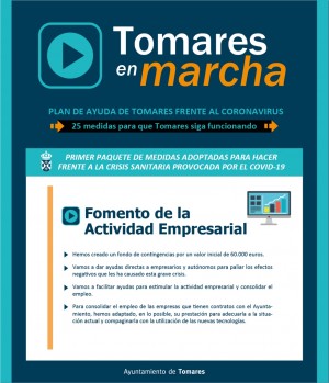 Este ambicioso Plan, "Tomares en marcha" cuenta, en esta primera fase, con 25 medidas para reactivar la economía local y fomentar la actividad empresarial, con ayudas para los comerciantes, hosteleros y empresarios, así como usuarios de las instalaciones deportivas y alumnos de los Talleres Municipales de Cultura. El objetivo es apoyar a todos los colectivos de la sociedad tomareña. Aquí dentro puede descargar cada una de las medidas adoptadas.