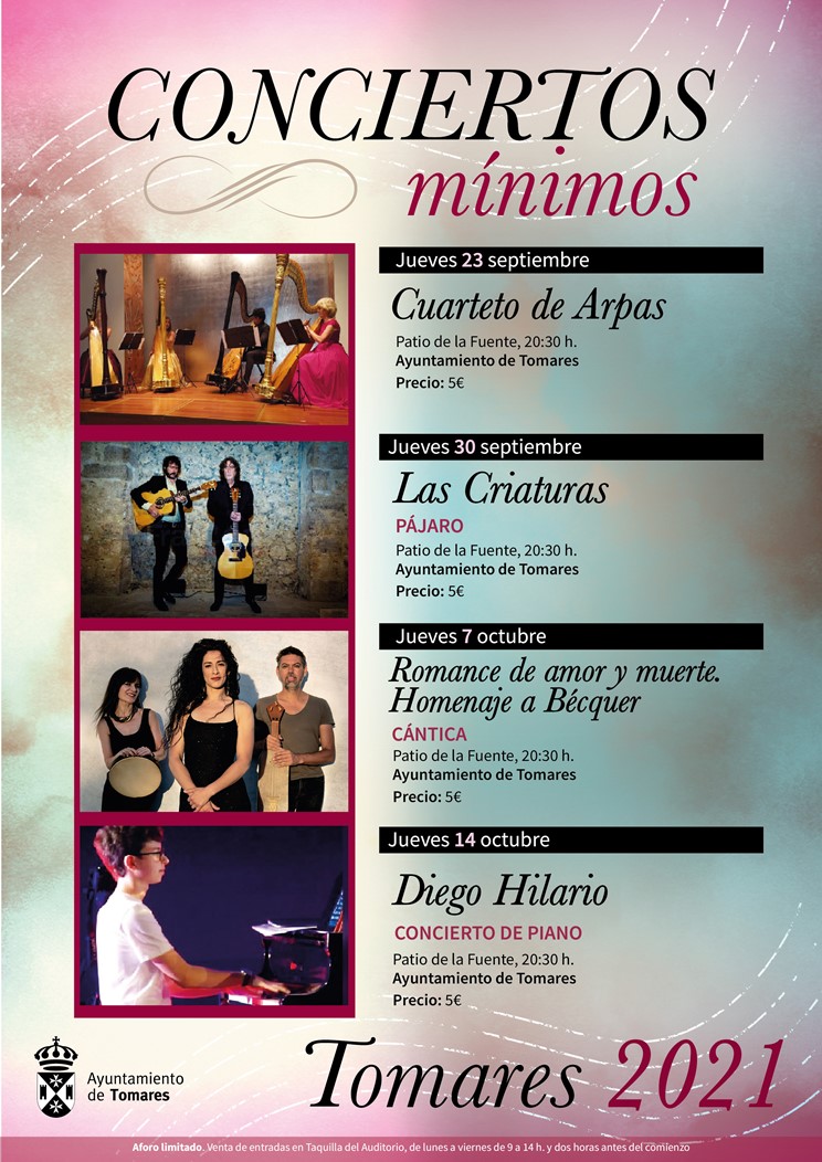 El mes de octubre, el ciclo de “Conciertos Mínimos” traerá a Tomares el jueves 7 al grupo de música antigua Cántica que ofrecerá el espectáculo “Romance de Amor y Muerte. Homenaje a Bécquer”. Y el 14 de octubre, un concierto de piano a cargo del pianista Diego Hilario Rueda de los Reyes.