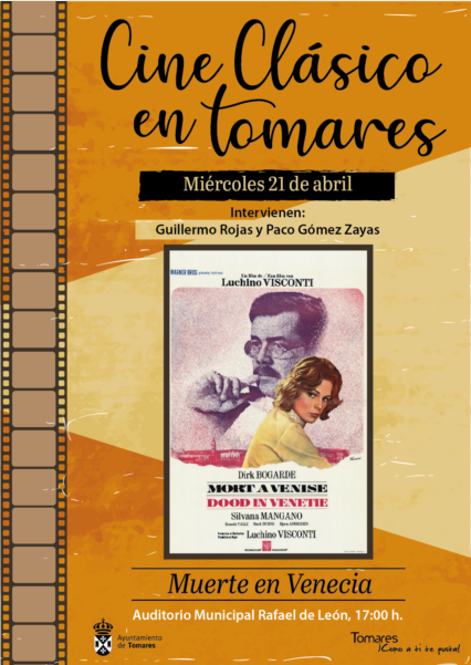 Los aficionados al Séptimo Arte tienen una nueva cita cultural en Tomares. El nuevo ciclo cultural “CineForum” dedicado al Cine Clásico, organizado por el Ayuntamiento de Tomares, a través de su concejalía de Cultura, ofrece este miércoles, 21 de abril, la película franco italiana “Muerte en Venecia” (1971) dirigida por Luchino Visconti. Intervendrán Guillermo Rojas y Paco Gómez Zayas.
