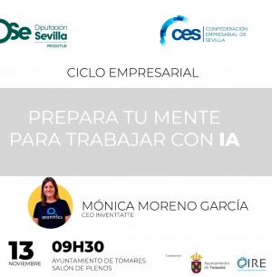 La Inteligencia Artificial es una potente herramienta para ayudar a las empresas, comercios o negocios a mejorar su productividad, eficiencia y competitividad. El Ayuntamiento de Tomares acogerá este jueves, 13 de noviembre, la interesante Conferencia “Prepara tu mente para trabajar con la Inteligencia Artificial”, ofrecida por Mónica Moreno García, CEO de Inventtatte, dirigida a empresarios, comerciantes, emprendedores y el público en general.