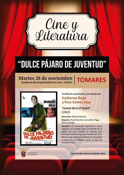 El Cinefórum “Cine y Literatura” del Ayuntamiento de Tomares ofrece este martes, 28 de noviembre, “Dulce pájaro de juventud” (1962), dirigida por Richard Brooks y protagonizada por Paul Newman Será, como es habitual, a las 18 horas, en el Auditorio Municipal Rafael de León. Entrada libre hasta completar aforo.