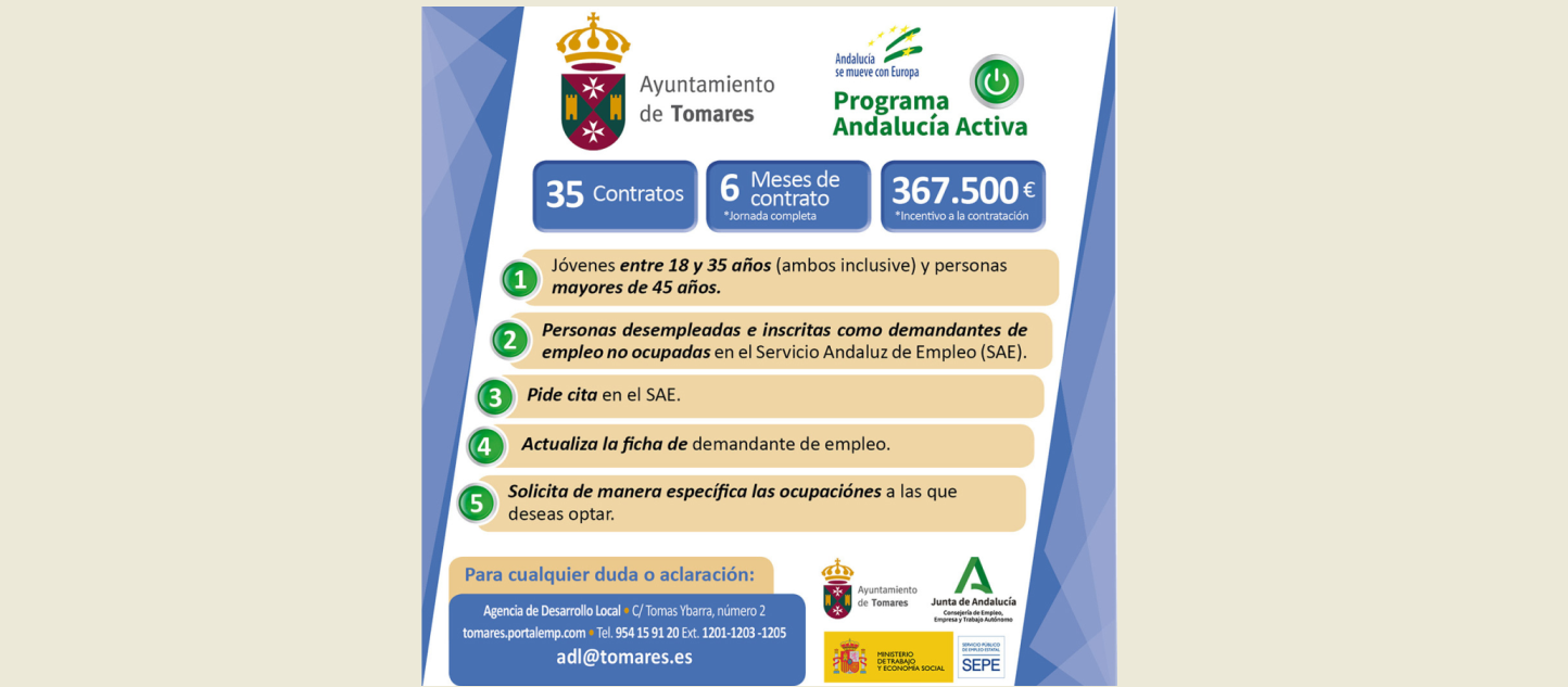 El Ayuntamiento de Tomares, en su apuesta por el empleo, va a poner en marcha el Programa de Empleo “Andalucía Activa” de la Junta de Andalucía, con el objetivo de fomentar el empleo y mejorar la empleabilidad.