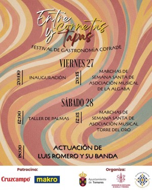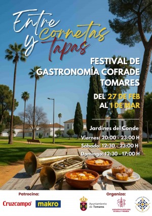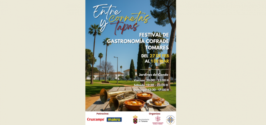 Tomares se convertirá en punto de encuentro ineludible para los amantes de la Semana Santa y de los platos típicos de la Cuaresma, el fin de semana del Día de Andalucía, del 27 de febrero al 1 de marzo, con “Entre Cornetas y Tapas”, I Festival de Gastronomía Cofrade, organizado por el Ayuntamiento de Tomares, la Asociación de Hostelería de Sevilla y Provincia, y la Academia Sevillana de Gastronomía y Turismo, y patrocinado por Cruzcampo y Makro, con el objetivo de impulsar la hostelería tomareña en esta época del año, promocionar la excelente gastronomía de la localidad y poner en valor las tradiciones de nuestra cultura.