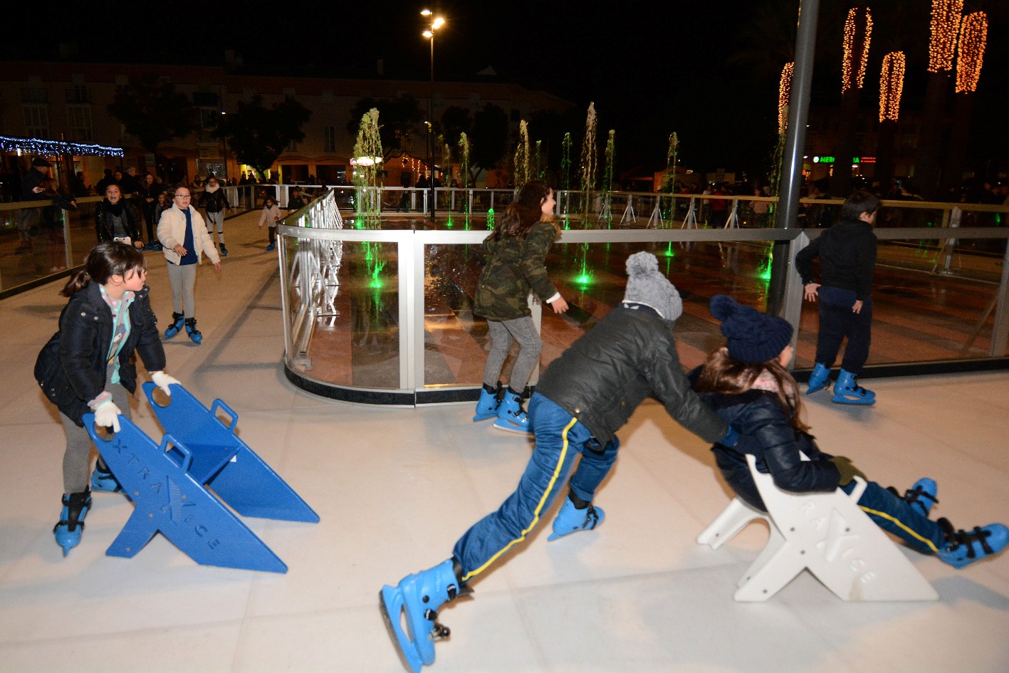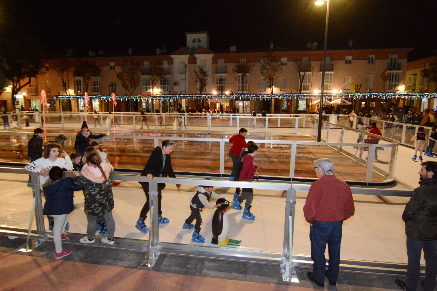 Niños, jóvenes y adultos han disfrutado de la pista de hielo, que este año contaba con una planta rectangular de 350 m2 de superficie y como novedad rodeaba la fuente de luces de la recién remodelada Plaza del Ayuntamiento, creando al anochecer todo un espectáculo de color y fantasía.