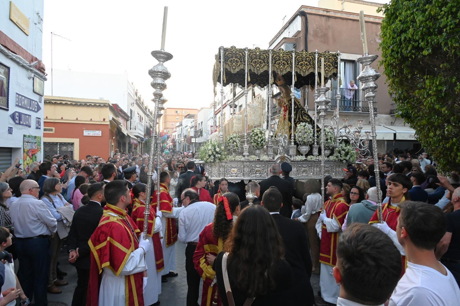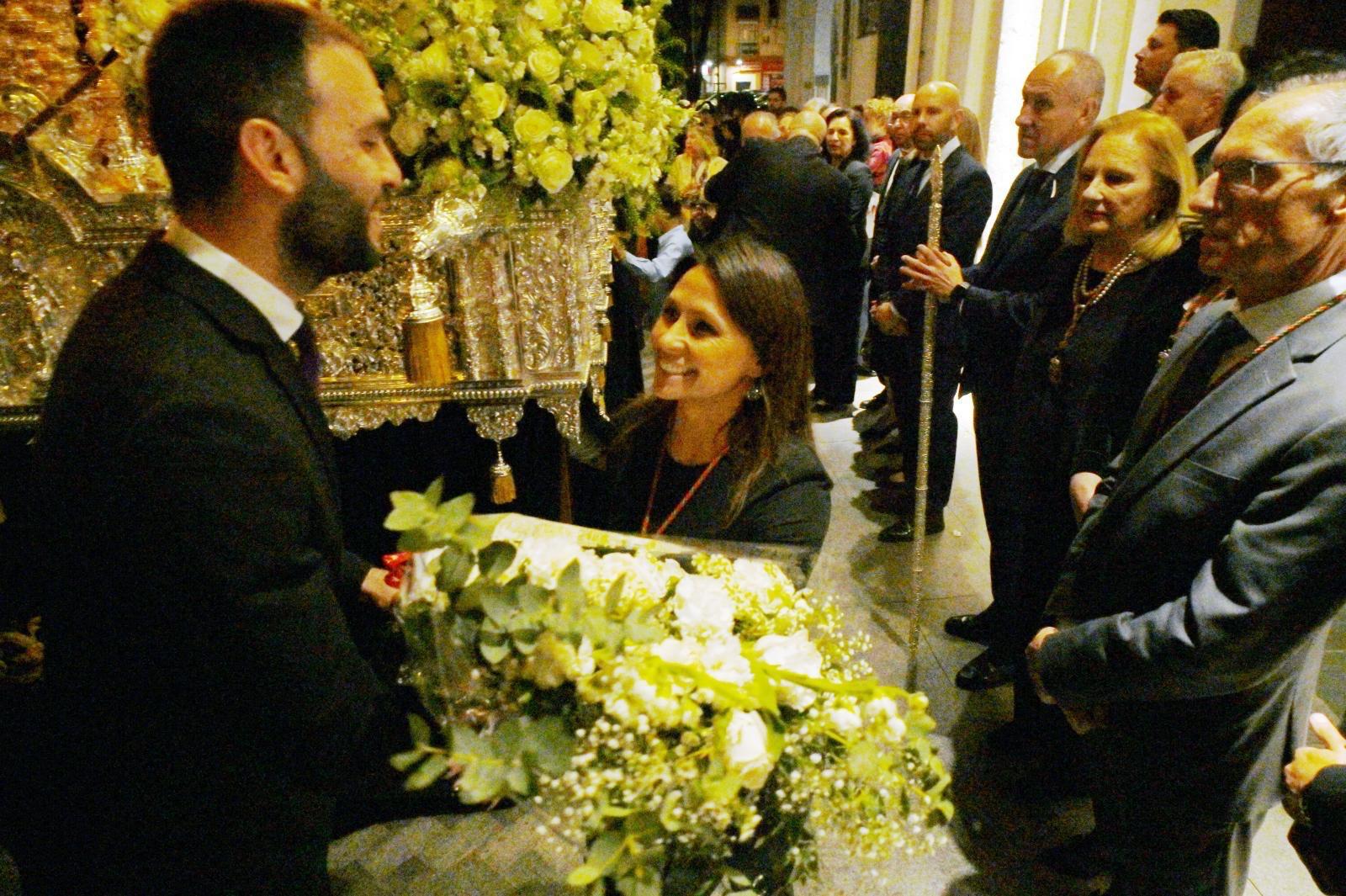 Una salida procesional que estuvo cargada de emociones y de preciosas imágenes como las numerosas petaladas a la Virgen Ntra. Sra. de los Dolores, las sentidas saetas que el saetero Álex Ortiz le dedicó al Santísimo Cristo de la Vera Cruz y la Virgen Ntra. Sra. de los Dolores, en la calle Tomás Ibarra, o el artista local Joaquín Pavón, el paso de la cofradía por las Cuatro Esquinas o su llegada a la puerta principal del Ayuntamiento, donde el alcalde de Tomares, José María Soriano, junto a la delegada de Fiestas Mayores, María Toledo, y su Equipo de Gobierno, hizo entrega de la tradicional ofrenda floral al Smo. Cristo de la Vera Cruz y a la Virgen Ntra. Sra. de los Dolores.