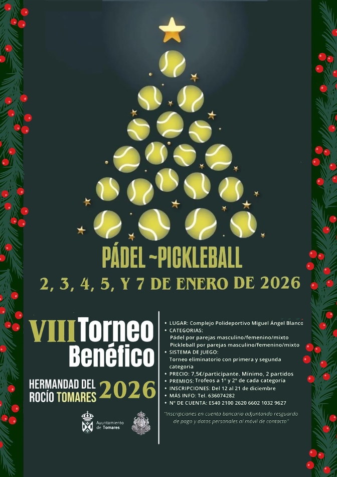 Es ya una tradición en Tomares comenzar el nuevo año con el Torneo Benéfico de Pádel y Pickleball, que todos los años organiza por Navidad la Hermandad del Rocío y el Ayuntamiento de Tomares. Del 2 al 7 de enero, las pistas del Complejo Polideportivo Miguel Ángel Blanco acogerán la octava edición de este tradicional torneo. Las personas interesadas pueden apuntarse hasta este domingo, 21 de diciembre. Todo lo que se recaude con la inscripción se destinará a la obra social de la Hermandad del Rocío.