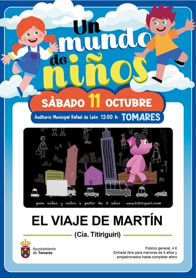 El Ayuntamiento de Tomares ofrecerá este sábado, 11 de octubre, el teatro de marionetas “El Viaje de Martín”, de la compañía Titiriguiri. Nueva propuesta de la iniciativa municipal “Un Mundo de Niños” que comenzó su nueva temporada 2025-26 el pasado sábado, 3 de octubre, con la historia de “Lua” de la Compañía Voilá. Será, como es habitual, a las 12:00 horas, en el Auditorio Municipal Rafael de León.