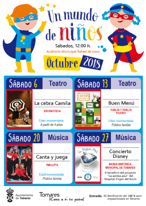 El ciclo cultural “Un Mundo de Niños” se ha convertido en todo un clásico en Tomares, pues acoge todos los sábados, a las 12 horas, en el Auditorio Municipal Rafael de León acoge una variada programación infantil de calidad con los mejores espectáculos de teatro, música, marionetas, magia y circo.