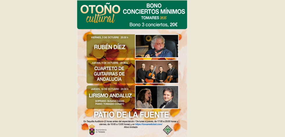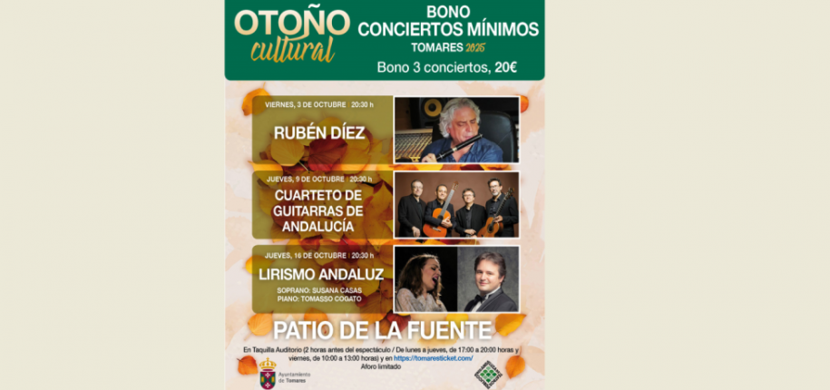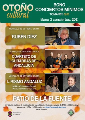 Vuelven al Patio de la Fuente del Ayuntamiento de Tomares, en octubre, los conciertos de carácter intimista, el Ciclo de “Conciertos Mínimos”, que traerá a tres destacadas agrupaciones de la escena musical: Rubén Díez Trío (el viernes 3), liderado por el flautista de reconocido mérito especializado en música tradicional irlandesa, Rubén Díez de la Cortina; el Cuarteto de Guitarras de Andalucía compuesto por cuatro de los guitarristas que lideran la escena musical actual en España (el jueves 9); y “Lirismo Andaluz”, composiciones, dramaturgia y poesía andaluza, con la bella voz de la reconocida soprano Susana Casas y el galardonado pianista Tomasso Cogato (el jueves 16). Tres espectáculos llenos de gran belleza y magia que entusiasmarán al público. A las 20:30 horas.