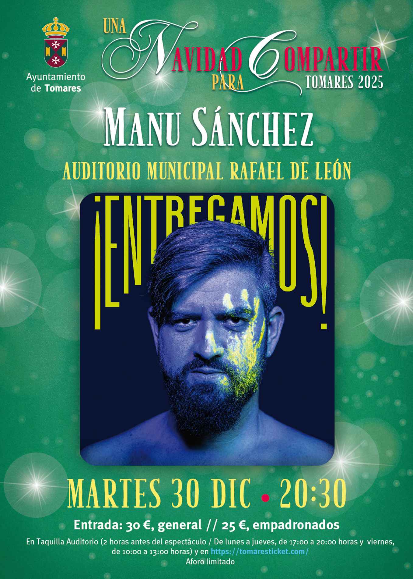 - Martes, 30 de diciembre: Manu Sánchez con su nuevo show “¡Entregamos!: un grito de sinceridad hecho espectáculo”, a las 20:30 horas. Entradas: 25 euros empadronados; y 30 euros, el resto, aquí: https://tomaresticket.com/entregamos-un-grito-de-sinceridad-hecho-espectaculo/