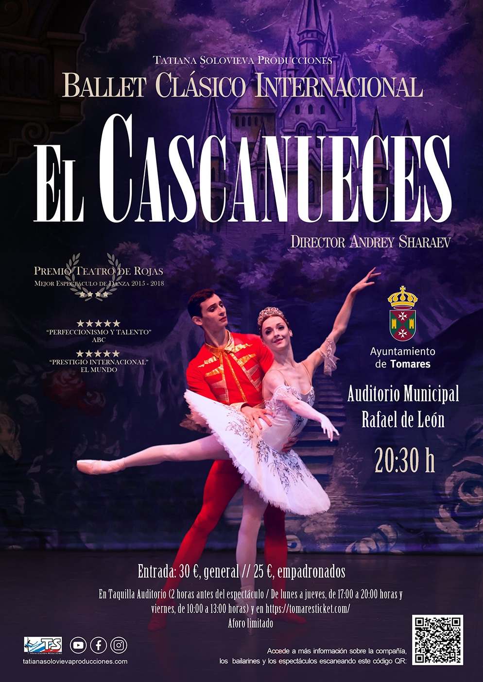 - Viernes, 12 de diciembre: Ballet Clásico Internacional “El Cascanueces”, de Tatiana Solovieva Producciones, a las 20:30 horas. Entradas: 25 euros empadronados; y 30 euros, el resto, aquí: https://tomaresticket.com/el-cascanueces-ballet/