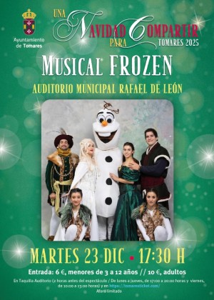- Martes, 23 de diciembre: Musical “Frozen”, a las 17:30 horas. Entradas: 6 euros menores de 3 a 12 años, y 10 euros, adultos, aquí: https://tomaresticket.com/musical-frozen/