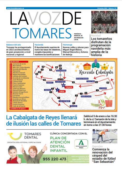 El periódico nº 137 de “La Voz de Tomares”, de Diciembre 2022 - Enero 2023, informa, además, de la supresión de nuevo de la tasa de veladores, congelación de impuestos y mantenimiento de las bonificaciones; las nuevas calles y plazas en Tomares para Miguel Ángel Blanco, Manuel Bizcocho y Antonio de Nebrija, la renovación del césped artificial de Estadio Municipal de Fútbol San Sebastián. Y como no, de la programación navideña más amplia de la historia de Tomares, con más de un centenar de actividades, entre ellas, la salida del Heraldo el martes 3 de enero.